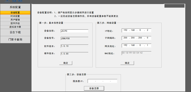 设备注册成功后,再次修改IP、或者名称后,会提示注册失败。这时需要重新将设备初始化,且在设备资料维护中将以前注册的设备删除。(此点再拿电脑给客户现场演示的时候会遇到,需要注意)