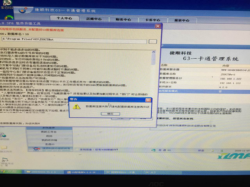 1. 在速通II软件V1.3.1和G3V5.1.0打补丁时,数据库升级时提示“数据库连接失败”,如下图: