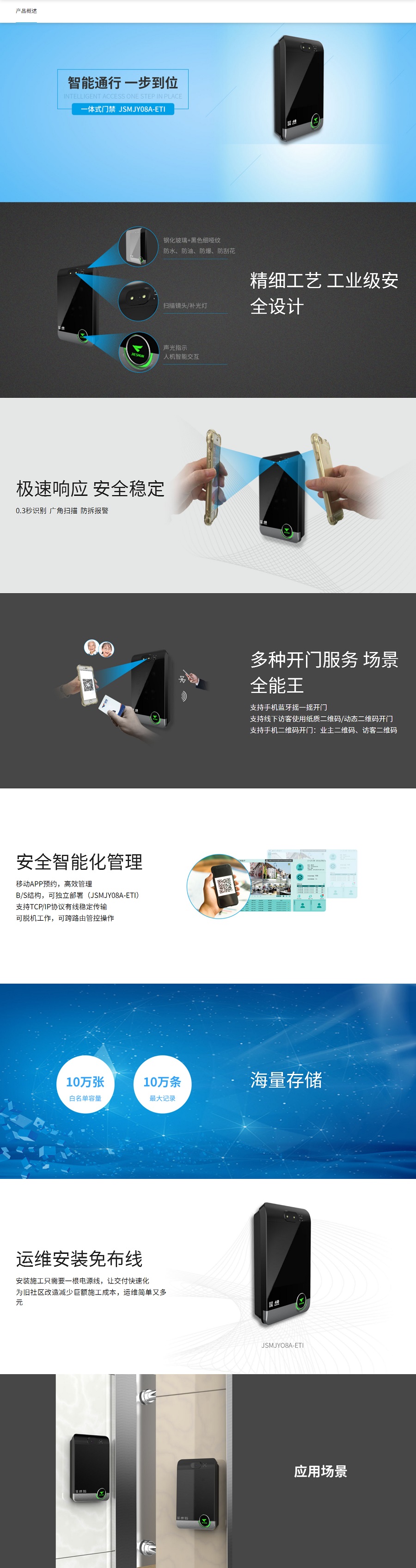 免布线门禁JSMJY08A-ETI是一款针对旧社区⻔禁设备的改造升级,以最低的改造成本提供⾼科技的通⾏鉴权服务的门禁产品,除基本的刷卡通⾏以外,同时⽀持业主可以通过⼿机蓝⽛、访客通过⼆维码通⾏,造便捷化,具有部署方便、功能强大、改造成本小的特点。