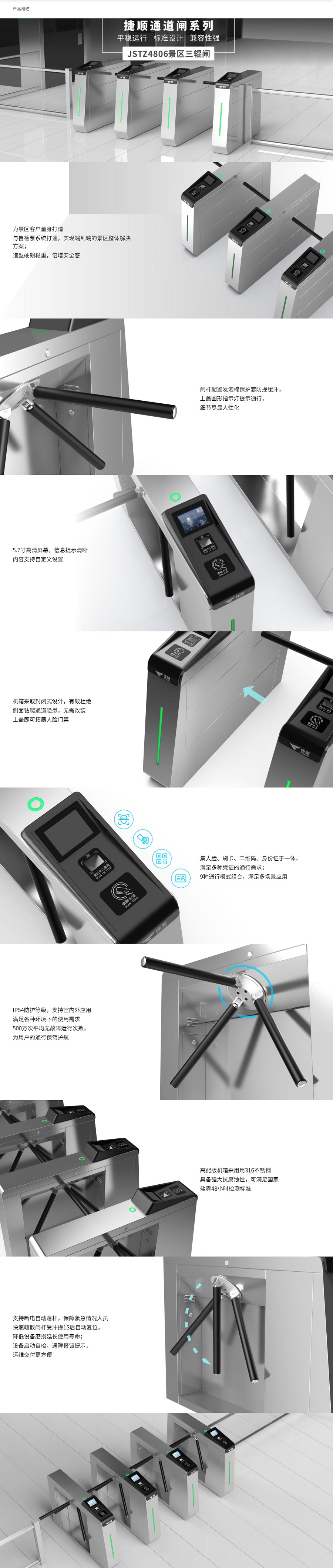 JSTZ4806定位于景区、演区场馆、体育场馆等场所的检票通行管控使用,作为该类场所的专业检票闸机,所有的功能都围绕着精确的市场场景需求设计,为我司专业化、行业化的高端系列产品。内置5.7寸高清屏幕时刻显示通行信息,配合语音播报,极大地提升通行时人机交互体验。