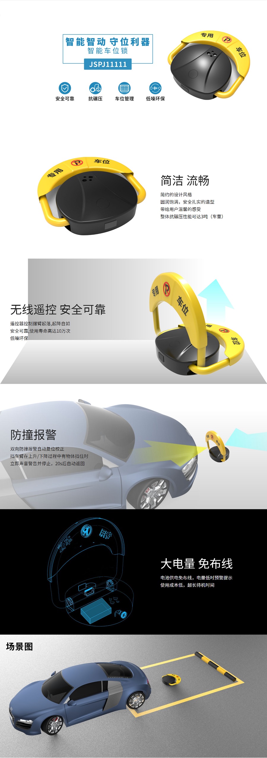 车位锁主要定位于智慧社区和智慧商业停车场解决方案,可广泛应用于各类停车场,满足停车场的停车管理应用,也可独立应用于路内外车位管理,其具有双向防撞报警自动复位功能、智能升降、专用车位牌、上升遇阻返回、下降遇阻停止、可泡水工作等功能,其采用地面固定方式安装,具备2.4G和433M两种无线通讯方式,当其它车辆或人碰到车位锁挡车臂时,会发出类似警笛响声,提示车位异常,防止车位被误用、抢占。