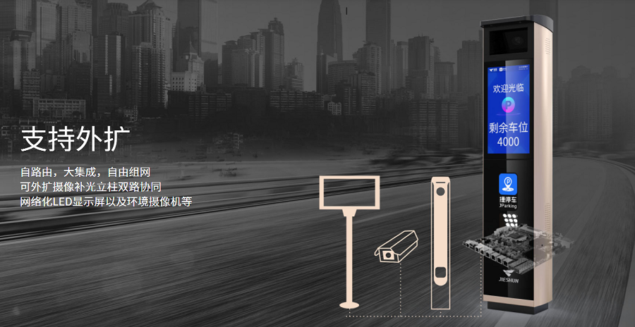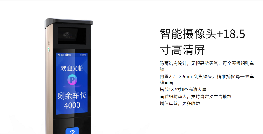 捷eⅢ型停车场集成车牌识别算法、高清摄像机和补光灯,是捷顺停车场解决方案中的专业版一体式产品,主要面对追求解决方案的性价比、注重交付效率、追求车场广告运营能力的客户;18.5寸的LCD显示屏具有较高的交互性能和自定义广告运营能力,同时支持多种移动支付方式、远程运维、业务托管及无牌车动态扫码出入场。