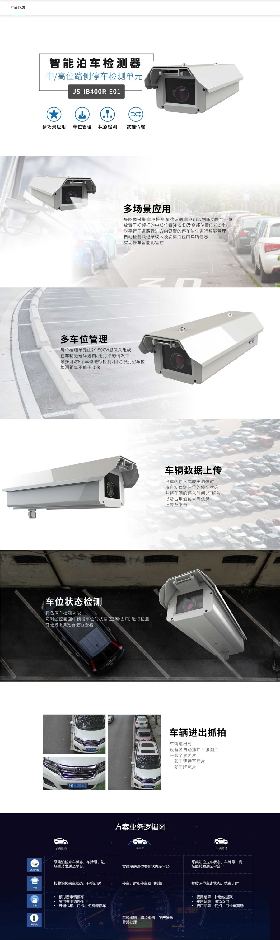 集图像采集 车辆检测 车牌识别 车辆出入判断功能与一体放置于视频杆的中部位置(4~5米)及高部位置(6~6.5米)对平行于道路行进方向设置的停车泊位进行智能管理自动检测及记录驶入及驶离泊位的车辆信息实现停车智能化管控