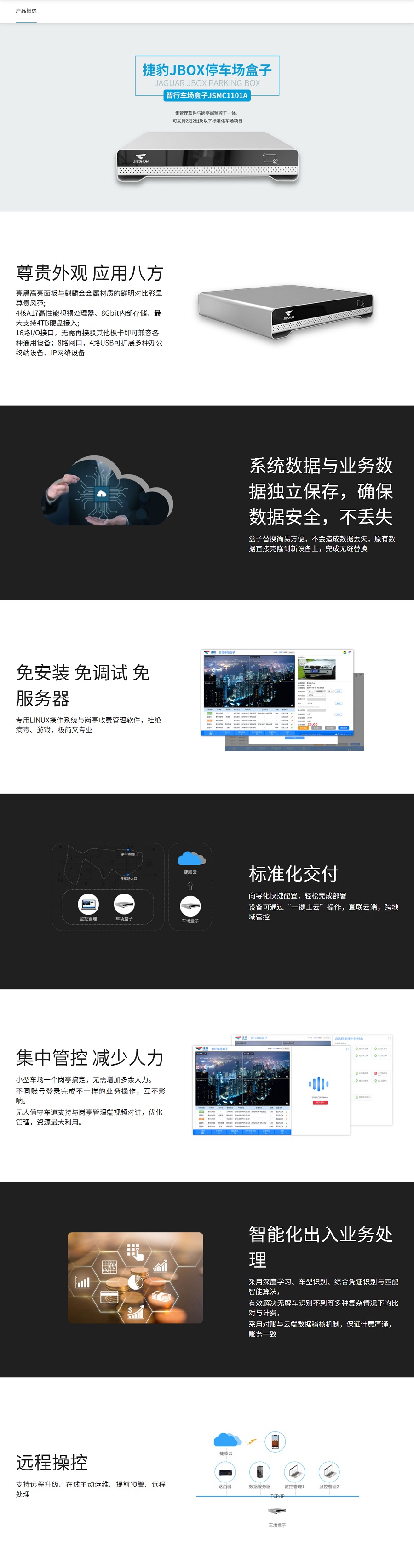 捷豹JBox停车场盒子是捷顺沉淀20年停车场⾏业经验研发的⼀体化停车业务管理嵌⼊式集成系统。采⽤⼯业级智能嵌⼊式硬件平台,软件采用工业级的嵌入式LINUX平台,软硬件⾼度集成,实现现场管理软件免部署,岗亭端、中心服务器端合一设计,兼容性强,有效规范管理⼈员的⽇常⼯作⾏为,整体降低系统的⽣命周期维护成本。全IP化管理出⼊⼝设备,⾃组⽹,智能运维,实现系统⾼度的可部署性、可靠性和可维护性。采⽤成熟的车牌、车型等综合凭证⽐对处理技术,通过可扩展可伸缩的组网技术和业务处理技术完全实现⽆⼈化值守,⽆⼈化运维,满⾜客户当前与未来的管理和业务发展需要。
