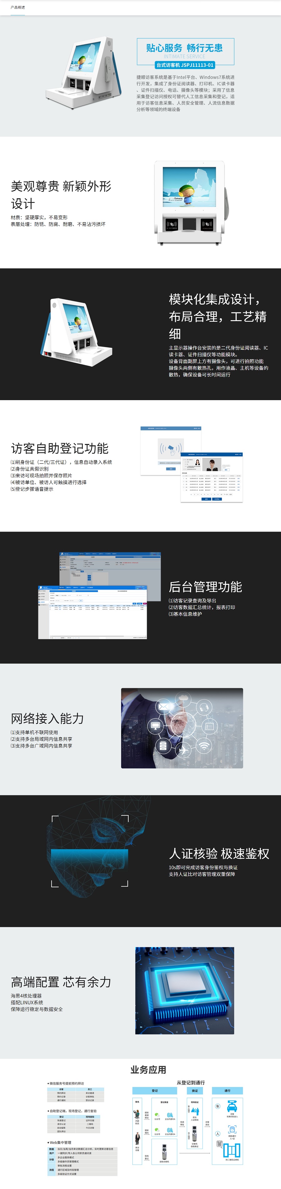 访客机是一款基于Intel平台、Windows7系统进行开发,集成了身份证阅读器、打印机、IC读卡器、证件扫描仪、电话、摄像头等模块;采用了信息采集登记访问授权,可替代人工信息采集和登记,适用于访客信息采集、人员安全管理、人流信息数据分析等领域的终端设备。